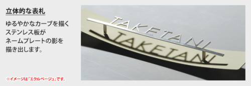 ネームプレートの文字が太陽の光を浴びてその影を映すオブジェのような表札です。
