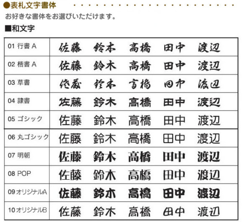様々な書体に対応いたします。漢字だけでなく、カタカナ、ひらがなでも文字のご指定を頂けます。