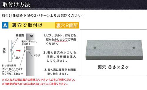 取付方法につきましても、以下3パターンよりお選び頂けますが、表札自体の重量の為、埋込み取り付けをお勧め致します。