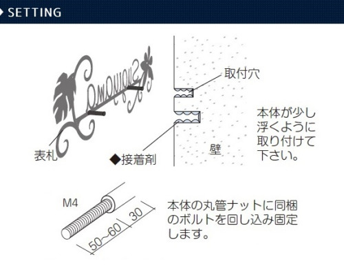 取付方法(ボルト取付・接着剤取付等)、書体等、