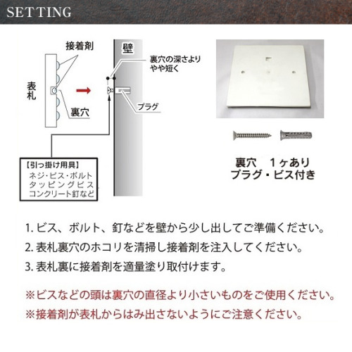 取付は裏穴が1箇所開いているので、ビスに引っ掛けて接着剤で固定する方法となります
