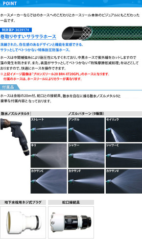 ホースは余裕の20m付、蛇口との接続具、散水ノズルメタル9と