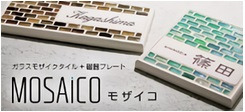 ガラスモザイクタイルが太陽の光を吸収して輝く表札です