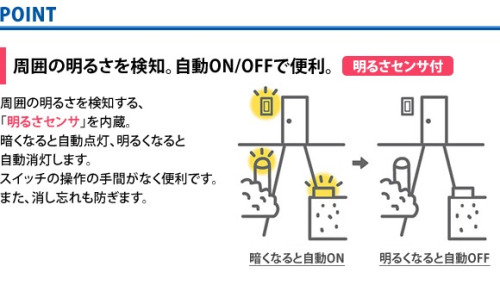 周囲が暗くなると明るさセンサーの働きで100%の明るさに自動点灯