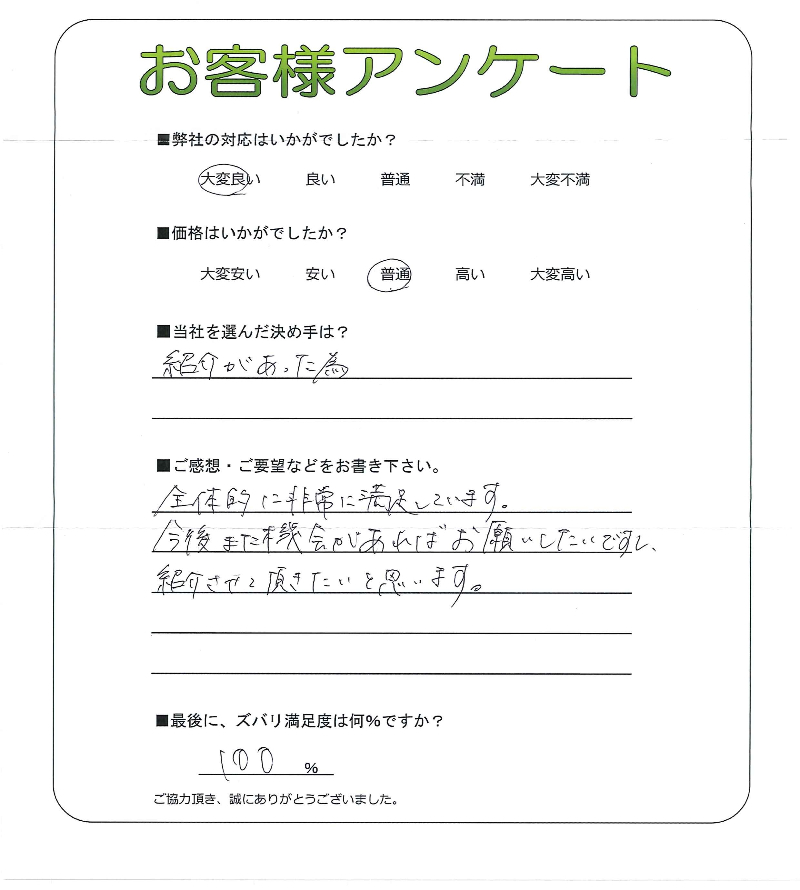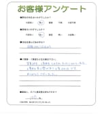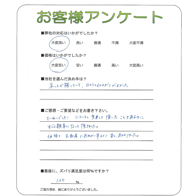 見積もりの打ち合わせから大変分かりやすく色々お教えいただきありがとうございました。仕合がり、価格、ご対応すべて満足です。また機会があればよろしくお願いいたします(*~~)`
