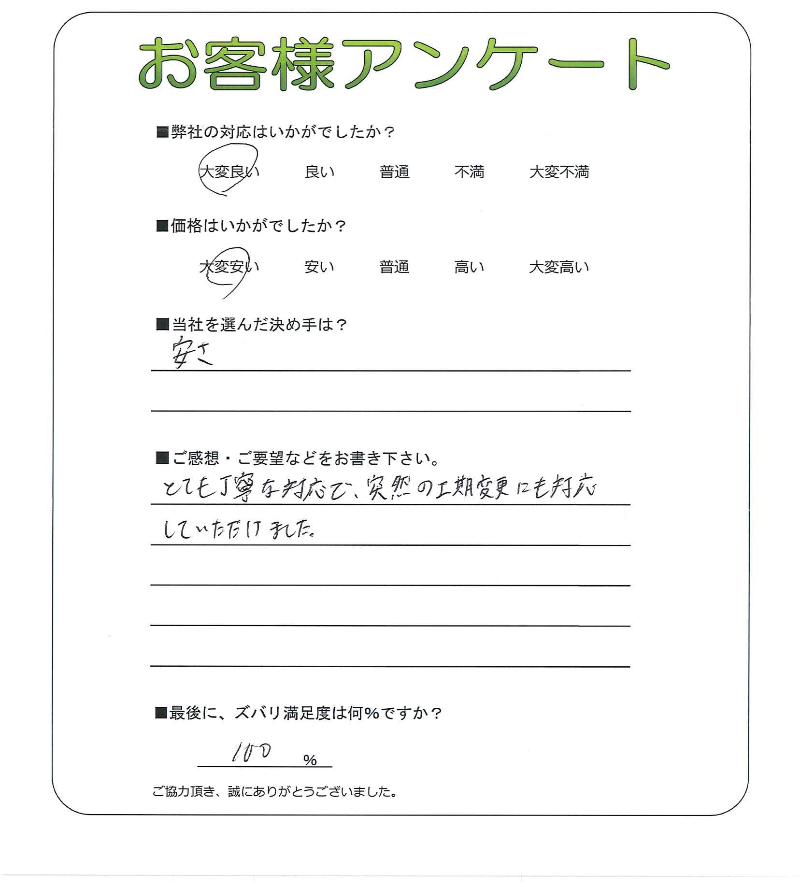 とても丁寧な対応で、突然の工期変更にも対応していただけました。