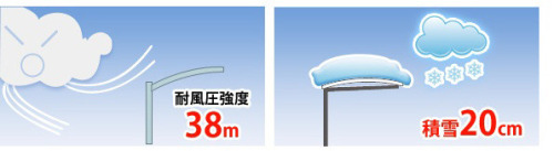 最大38m/秒の耐風圧、積雪20cmまでの強度がありますので、風にも雪にも安心です