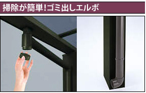 雨樋上部には、風雨で樋に詰まった葉なども簡単に取り除ける「ゴミ出しエルボ」、