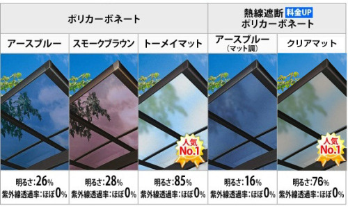 屋根材は、ポリカーボネートと熱線遮断ポリカーボネートからお選びいただけます