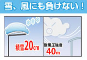 また、耐風圧強度40m、耐雪強度は20cmまでと突然変化する天候にも対応するタフな面も