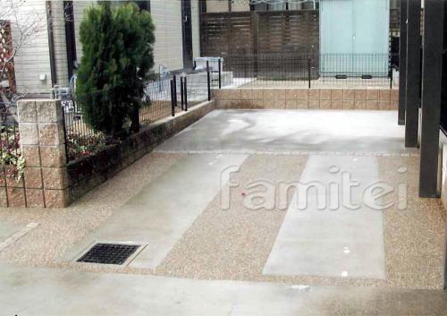 アプローチは乱形石貼り、車庫はコンクリート敷きに。