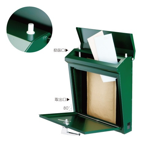 上蓋から投函された郵便物は、前面の取っ手を回転させ