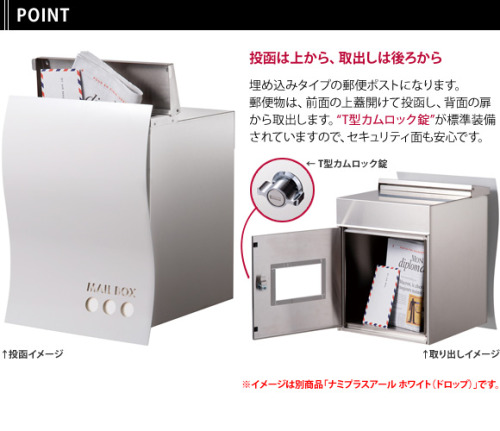 投函口の取ってやプッシュボタンで取出しに加え鍵も付属と防犯面も考慮されており、
