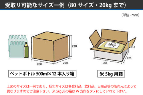 宅配業者ダンボール規格80サイズ、20kgまでの受取りが可能です