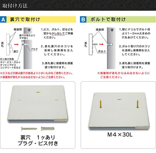 取付方法(ボルト取付・接着剤取付等)、書体等、