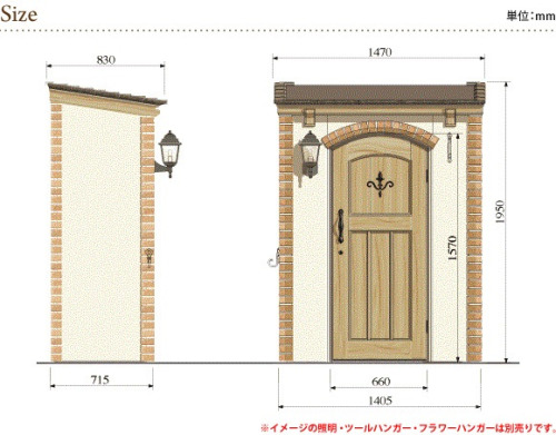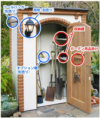 こちらの商品には、収納棚、ガーデン用品掛けが標準装備されています
