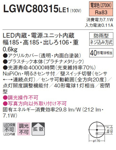 LEDブラケットライト LGWC80315LE1(明るさセンサー付) ★シンプルなデザインが魅力的★2021/12/11(土)