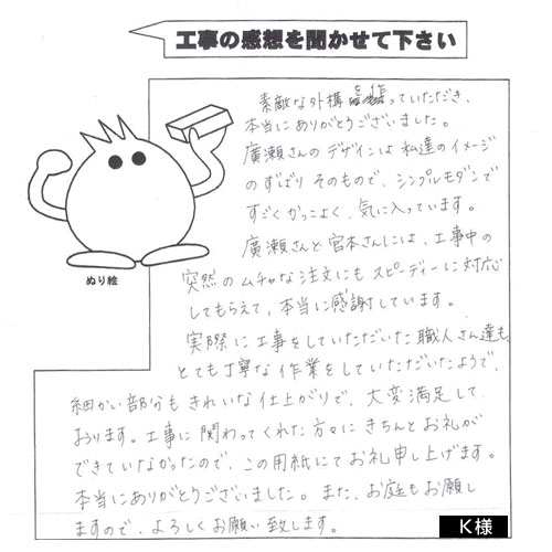 実際に工事をしていただいた職人さん達もとても丁寧な作業をしていただいたようで、細かい部分もきれいな仕上がりで、大変満足しております。工事に関わってくれた方々にきちんとお礼ができていなかったので、この用紙にてお礼申し上げます。本当にありがとうございました。また、お庭もお願いしますので、よろしくお願い致します。