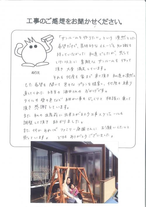 「サンルームを作りたい」という漠然とした希望だけで、具体的なイメージも知識も持っていなかった私達でしたが、思っていた以上に素敵なサンルームを作って頂き、大変満足しています。それも何度も家まで来て頂き、私達の漠然とした希望を聞いて色々なプランを提案し、何度も練り直してくれた担当の酒井さんのおかげです。タイルや壁の色など細かい事もじっくりと相談に乗って頂き感謝しています。また私の出産前に出来上がるよう工事スケジュールも調整して頂き助かりました。また何かあればファミリー庭園さんにお願いしたいと思っています。どうもありがとうございました。