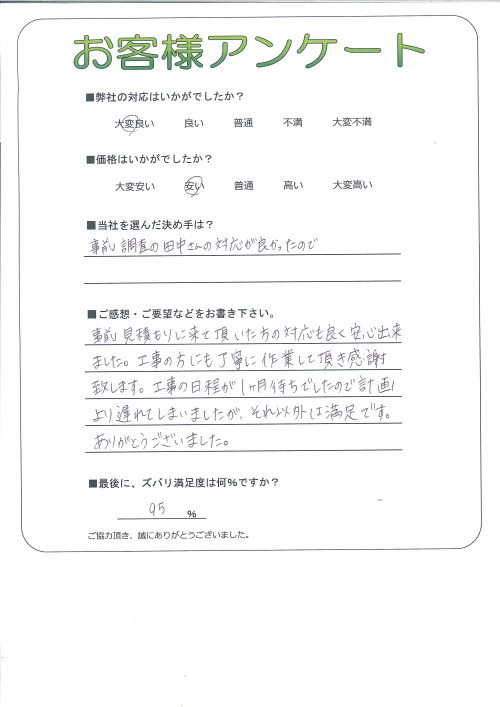 事前見積もりに来て頂いた方の対応も良く安心出来ました。工事の方にも丁寧に作業して頂き感謝致します。工事の日程が1ヶ月待ちでしたので計画より遅れてしまいましたが、それ以外は満足です。