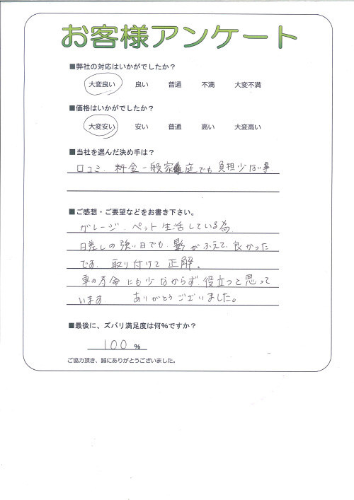 ガレージ、ペット生活している為日差しの強い日でも、影がふえて、良かった