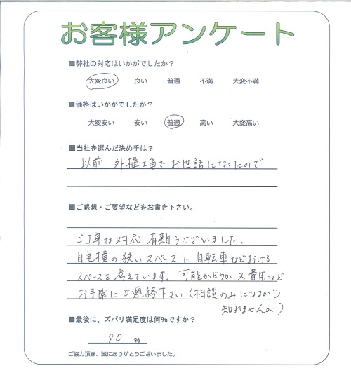 ご丁寧な対応有難うございました。自宅横の狭いスペースに自転車などおけるスペースを考えています。可能かどうか、又、費用などお手隙にご連絡下さい(相談のみになるかも知れませんが)