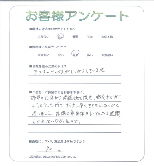 昨年の12月から商談させて頂き、完成までが4月になった所でもう少し早くできなかったのかと思いました。外構工事自体はトータルで2週間もかかっていなかったので。