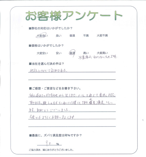 施工前までの打ち合わせから完了までメールを通じて素早く対応頂きました。職人の方もていねいに作業して頂き大変満足しています。ありがとうございました。