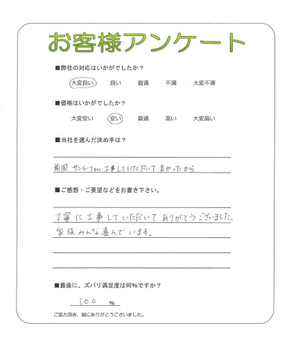 丁寧に工事をしていただいて ありがとうございました。家族みんな喜んでいます。