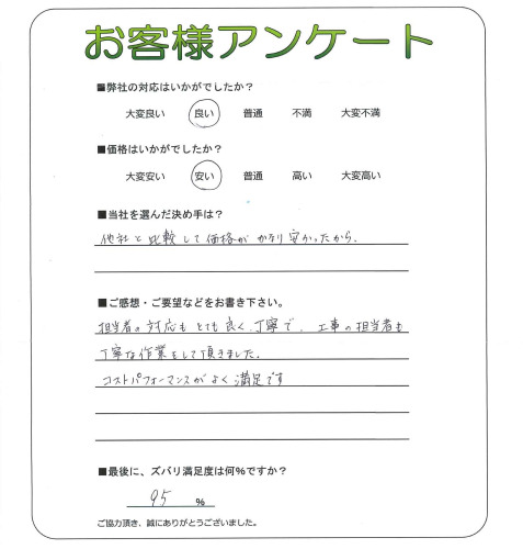 担当者の対応もとても良く丁寧で、工事の担当者も丁寧な作業をして頂きました。コストパフォーマンスがよく満足です