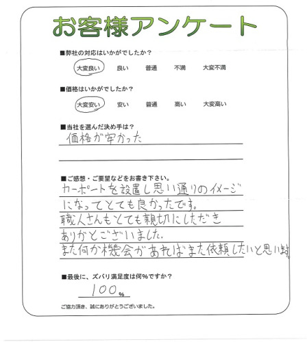 カーポートを設置し思い通りのイメージになってとても良かったです。職人さんもとても親切にしただきありがとうございました。また何か機会があればまた依頼したいと思います。