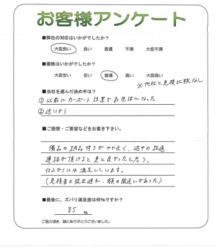 備品の納品待ちがやや長く、途中の経過連絡が頂けると更に良かったと思う。仕上がりには満足しています。(見積り書の提出遅れ、額の間違いがあった)