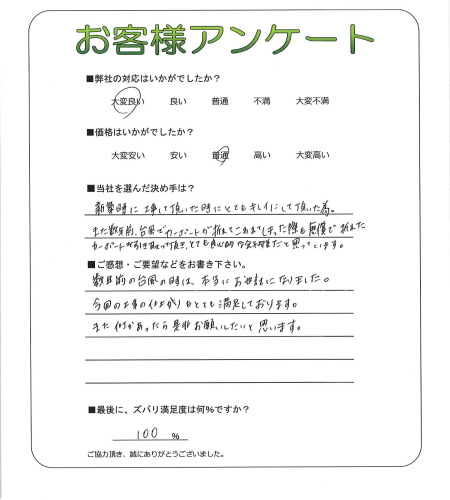 数年前の台風の時は、本当にお世話になりました。今回の工事の仕上がりもとても満足しております。また何かあったら是非お願いしたいと思います。