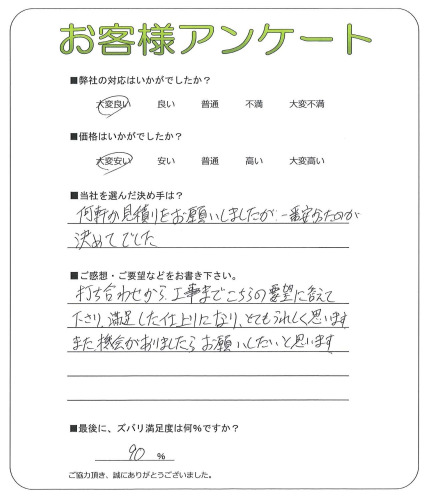 打ち合わせから工事までこちらの要望に答えて下さり、満足した仕上りになりとてもうれしく思います。また、機会がありましたらお願いしたいと思います。